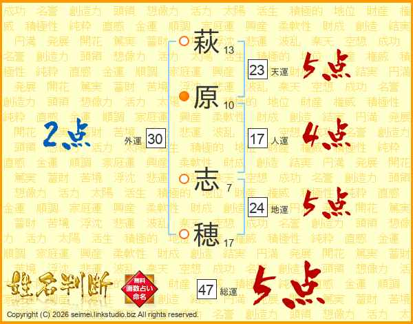 生活面を象徴する運勢です。外部から受ける影響力を表し、結婚運、家庭運や職場、環境への順応性を表します。総運から人運を引いた画数。姓や名が1文字の場合を除く。