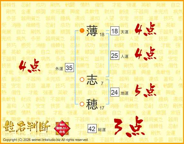 家系が持つ宿命的な運勢を表します。祖先から受け継いだ苗字ですので自分の力が及びません。家柄を象徴します。苗字の合計画数。
