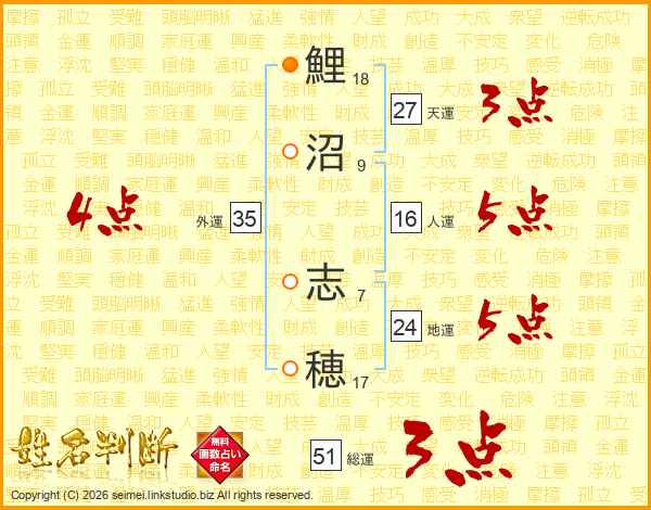 鯉(18画)沼(9画) 志(7画)穂(17画)