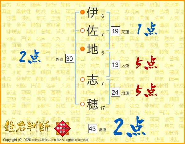 伊(6画)佐(7画)地(6画) 志(7画)穂(17画)
