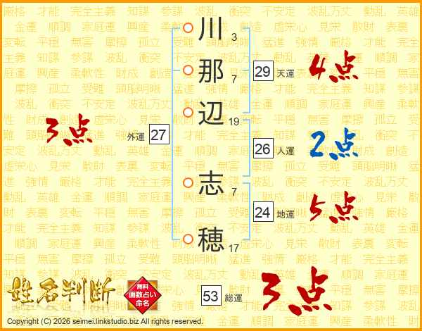 川(3画)那(7画)辺(19画) 志(7画)穂(17画)
