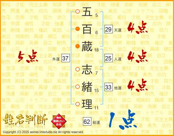 五(5画)百(6画)蔵(18画) 志(7画)緒(15画)理(11画)