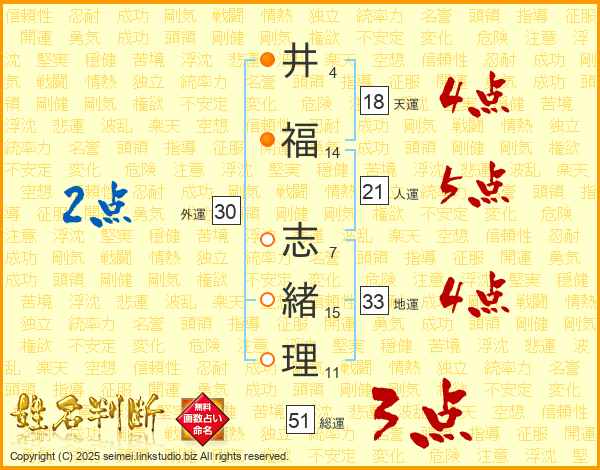 井(4画)福(14画) 志(7画)緒(15画)理(11画)