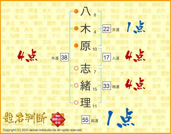 八(8画)木(4画)原(10画) 志(7画)緒(15画)理(11画)
