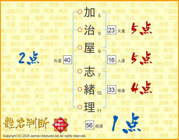 加(5画)治(9画)屋(9画) 志(7画)緒(15画)理(11画)