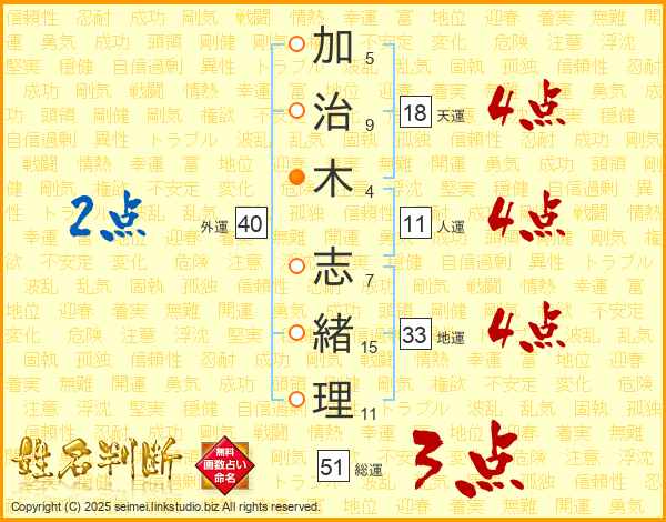 加(5画)治(9画)木(4画) 志(7画)緒(15画)理(11画)