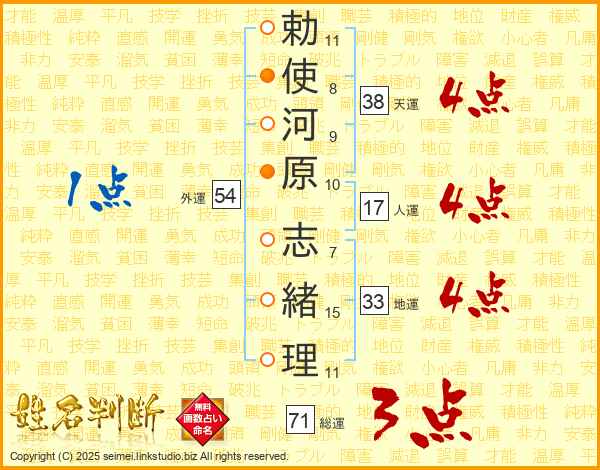 勅(11画)使(8画)河(9画)原(10画) 志(7画)緒(15画)理(11画)