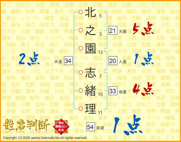 北(5画)之(3画)園(13画) 志(7画)緒(15画)理(11画)