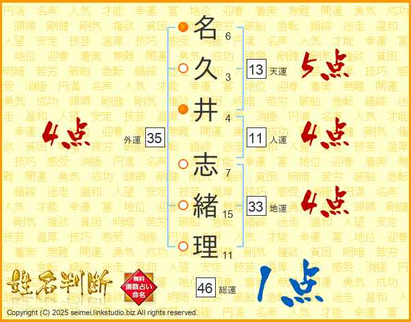 名(6画)久(3画)井(4画) 志(7画)緒(15画)理(11画)