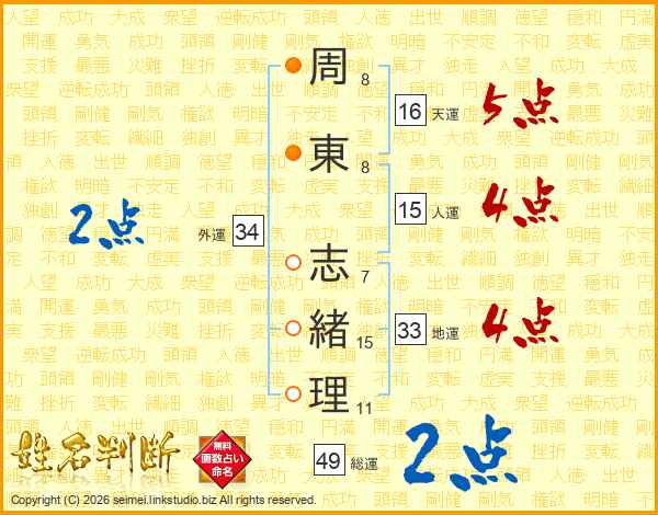 周(8画)東(8画) 志(7画)緒(15画)理(11画)