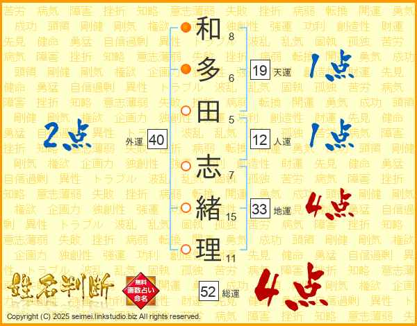 和(8画)多(6画)田(5画) 志(7画)緒(15画)理(11画)
