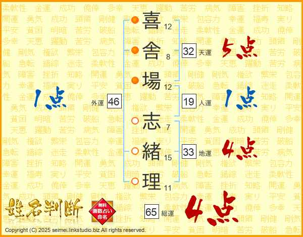 喜(12画)舎(8画)場(12画) 志(7画)緒(15画)理(11画)