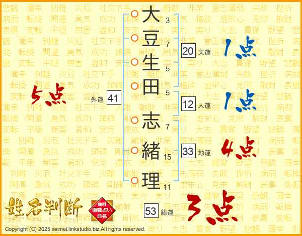 大(3画)豆(7画)生(5画)田(5画) 志(7画)緒(15画)理(11画)