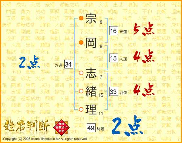 宗(8画)岡(8画) 志(7画)緒(15画)理(11画)