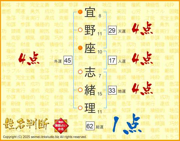 宜(8画)野(11画)座(10画) 志(7画)緒(15画)理(11画)