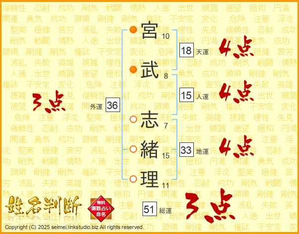 宮(10画)武(8画) 志(7画)緒(15画)理(11画)