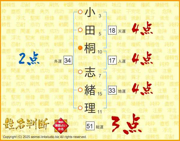 小(3画)田(5画)桐(10画) 志(7画)緒(15画)理(11画)