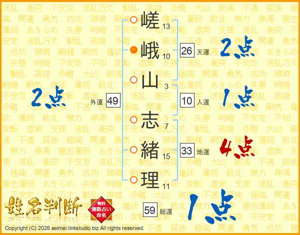 嵯峨山志緒理さんの天運は26画の2点!