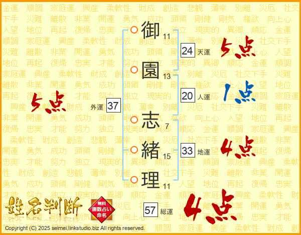 御(11画)園(13画) 志(7画)緒(15画)理(11画)