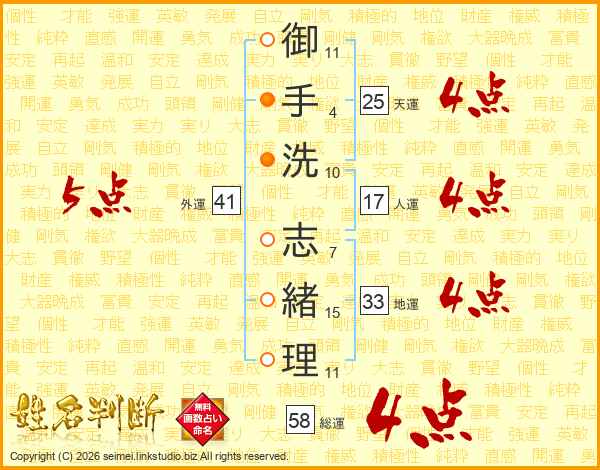 御(11画)手(4画)洗(10画) 志(7画)緒(15画)理(11画)