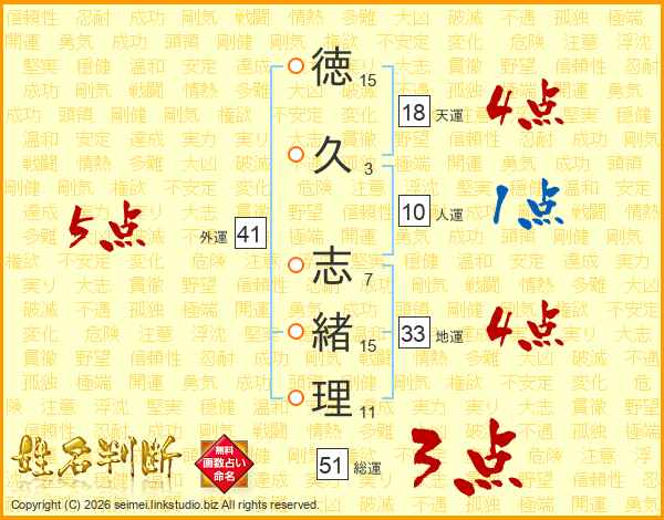 徳(15画)久(3画) 志(7画)緒(15画)理(11画)