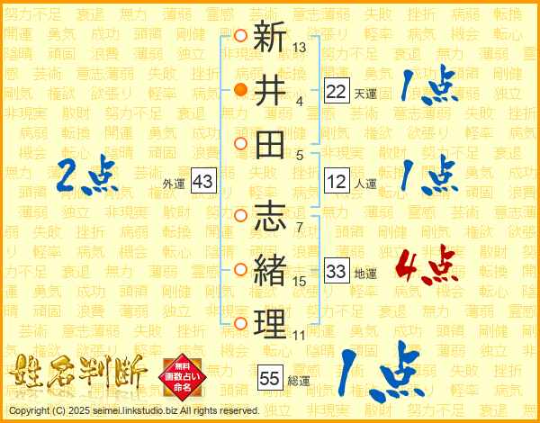 新井田志緒理さんの地運は33画の4点!