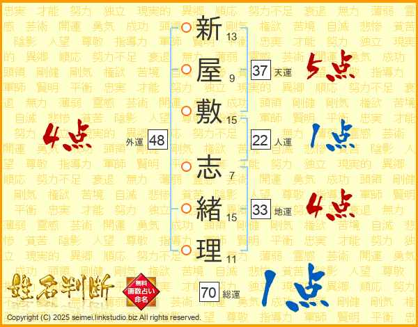 新(13画)屋(9画)敷(15画) 志(7画)緒(15画)理(11画)