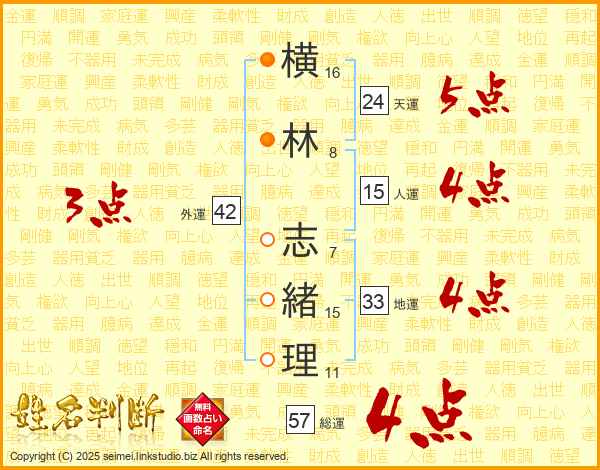 横(16画)林(8画) 志(7画)緒(15画)理(11画)