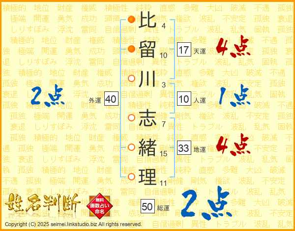 比(4画)留(10画)川(3画) 志(7画)緒(15画)理(11画)