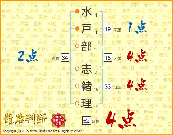 水(4画)戸(4画)部(11画) 志(7画)緒(15画)理(11画)