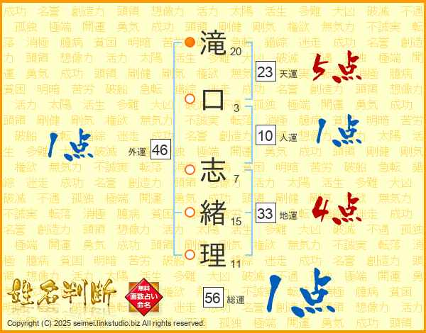 滝(20画)口(3画) 志(7画)緒(15画)理(11画)