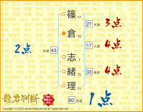 篠(17画)倉(10画) 志(7画)緒(15画)理(11画)