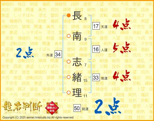 長(8画)南(9画) 志(7画)緒(15画)理(11画)
