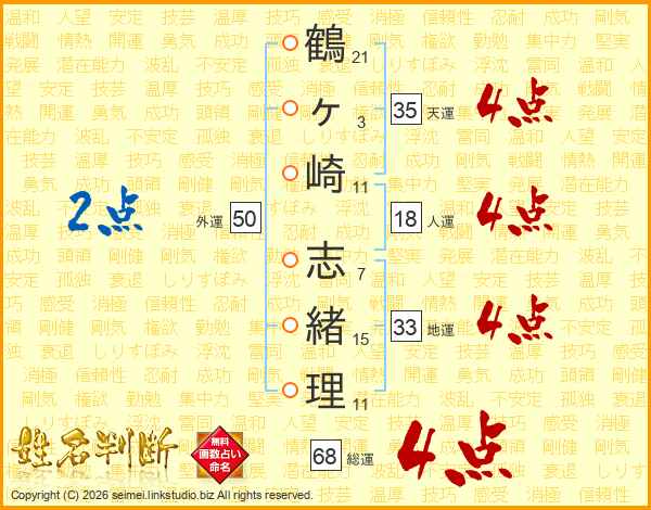 鶴ヶ崎志緒理さんの総運は68画の4点!