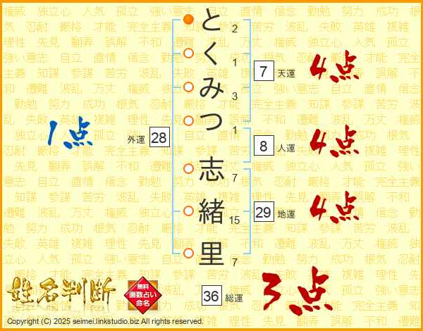 と(2画)く(1画)み(3画)つ(1画) 志(7画)緒(15画)里(7画)