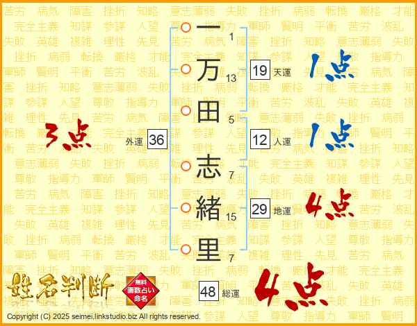 一(1画)万(13画)田(5画) 志(7画)緒(15画)里(7画)