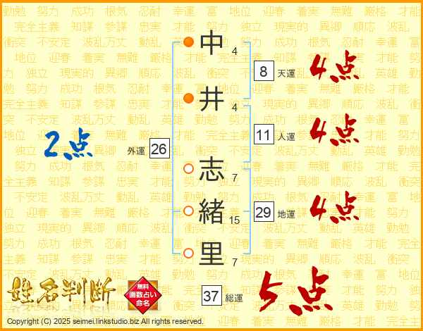 中(4画)井(4画) 志(7画)緒(15画)里(7画)