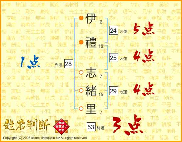 伊(6画)禮(18画) 志(7画)緒(15画)里(7画)
