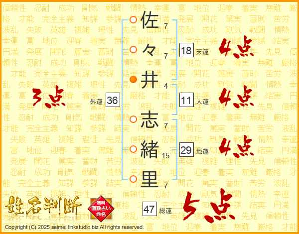 佐(7画)々(7画)井(4画) 志(7画)緒(15画)里(7画)