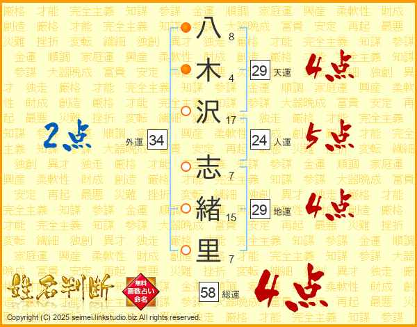 八(8画)木(4画)沢(17画) 志(7画)緒(15画)里(7画)
