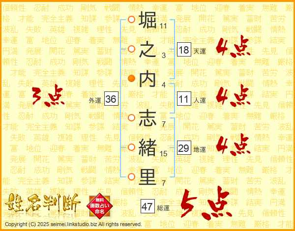 堀(11画)之(3画)内(4画) 志(7画)緒(15画)里(7画)