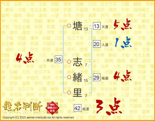 生活面を象徴する運勢です。外部から受ける影響力を表し、結婚運、家庭運や職場、環境への順応性を表します。総運から人運を引いた画数。姓や名が1文字の場合を除く。