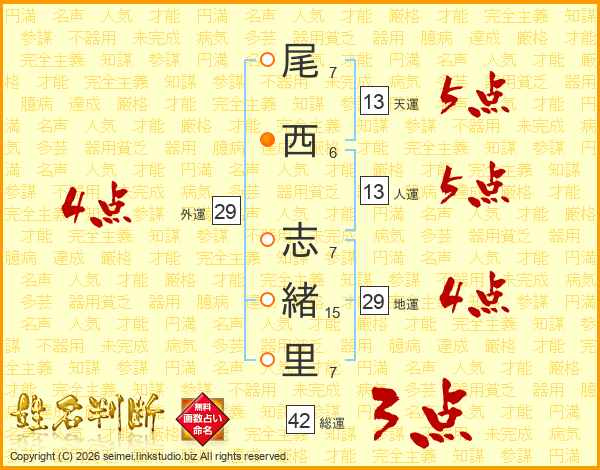 尾(7画)西(6画) 志(7画)緒(15画)里(7画)