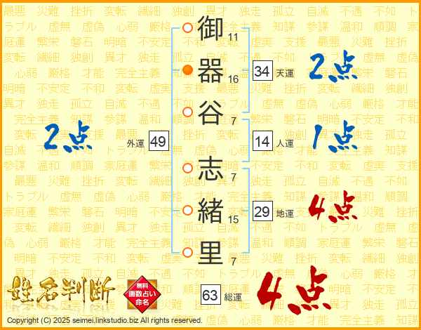御(11画)器(16画)谷(7画) 志(7画)緒(15画)里(7画)