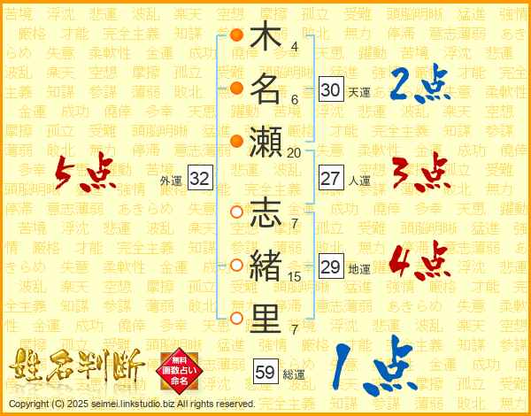 木(4画)名(6画)瀬(20画) 志(7画)緒(15画)里(7画)