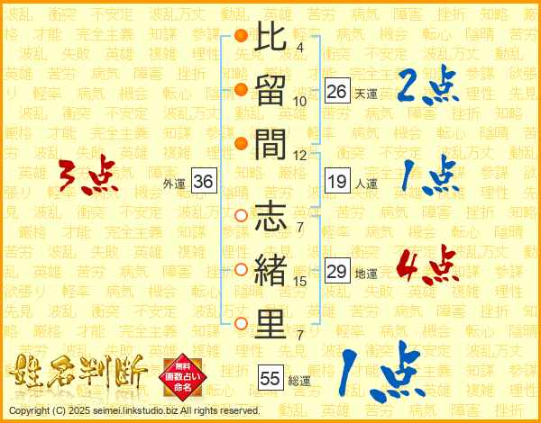比(4画)留(10画)間(12画) 志(7画)緒(15画)里(7画)