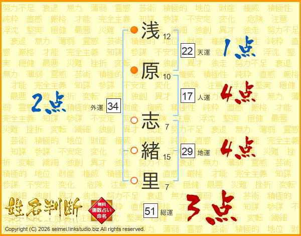 浅(12画)原(10画) 志(7画)緒(15画)里(7画)