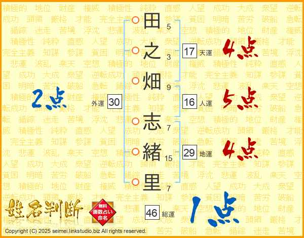 田(5画)之(3画)畑(9画) 志(7画)緒(15画)里(7画)