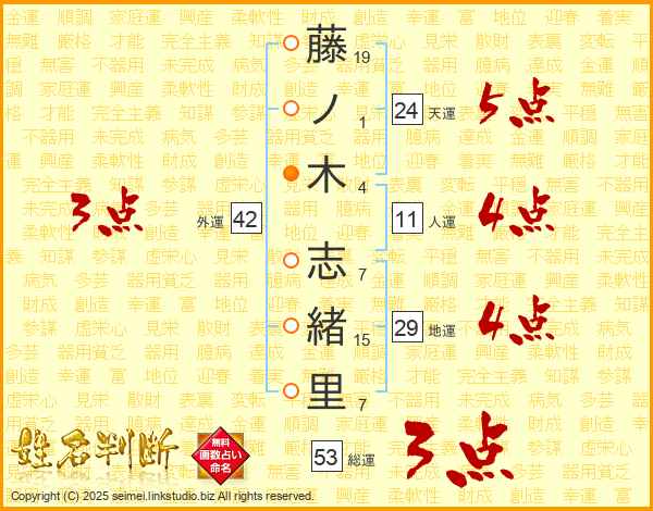 藤ノ木志緒里さんの天運は24画の5点!