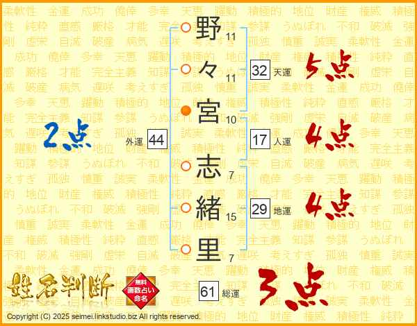 野(11画)々(11画)宮(10画) 志(7画)緒(15画)里(7画)